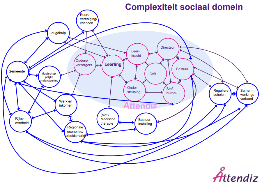 Paul: ‘Attendiz is onderdeel van zo’n complex systeem. (Voortgezet) speciaal onderwijs in deze regio is onderdeel van een keten van samenwerkingen met regulier onderwijs, zorginstellingen en gemeenten. Je doet het samen met heel veel partijen (tientallen) die allerhande deelbelangen hebben (zie het bijbehorende plaatje). Niet alleen heb je te maken met verschillende, lokale overheden, ook met landelijk beleid, de inspectie, zorginstanties, politie, collegae, werkgevers, etc. Je bevindt je in een bijzonder groot stakeholderveld met regelmatig verschillende perspectieven en belangen. Dat veld gedraagt zich als een complex systeem.