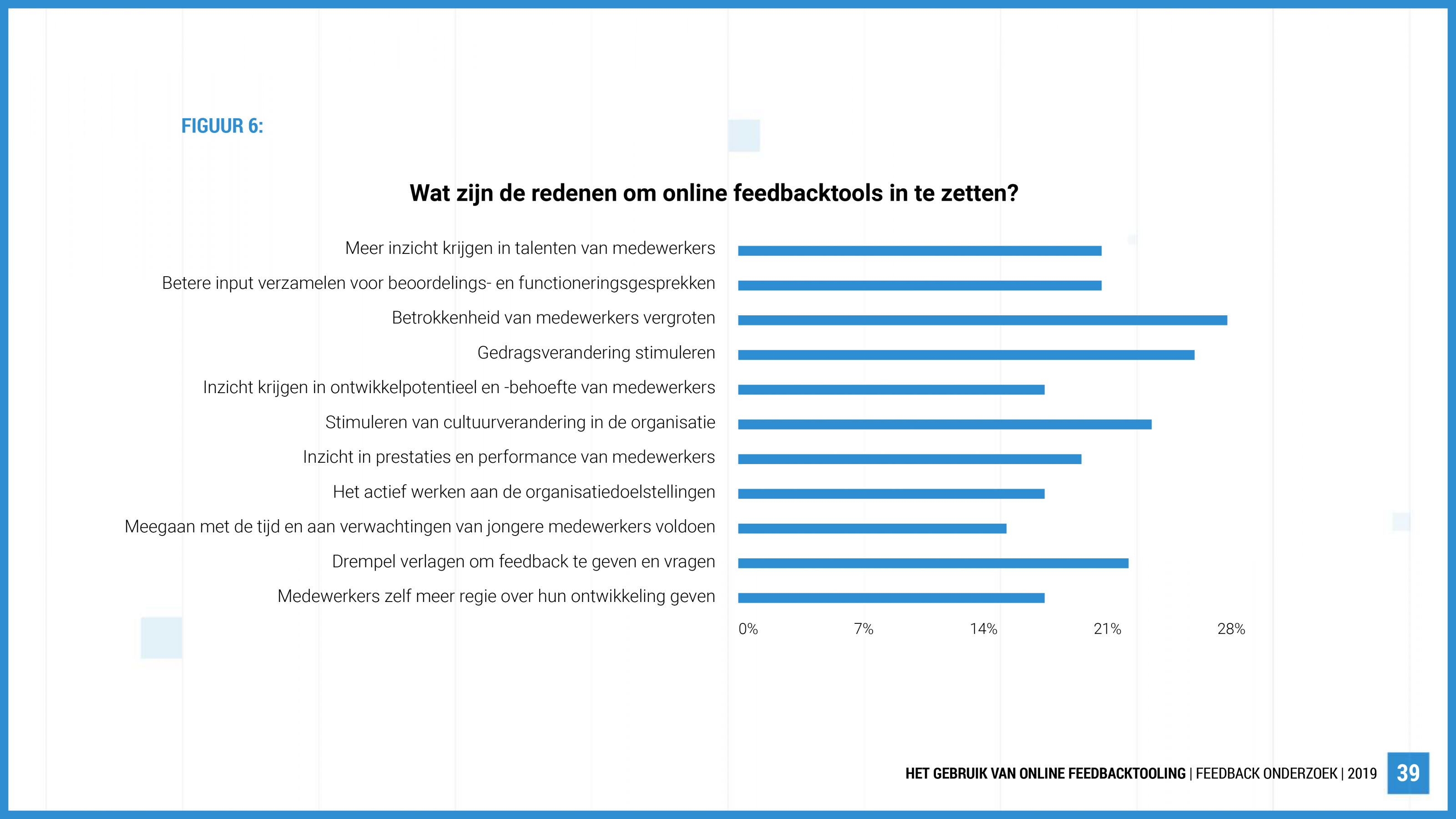 De redenen om online feedbacktools te gebruiken lopen sterk uiteen. Van de online feedbacktool gebruikers geeft 28% aan dat ze dit doet om de betrokkenheid van medewerkers te vergroten.