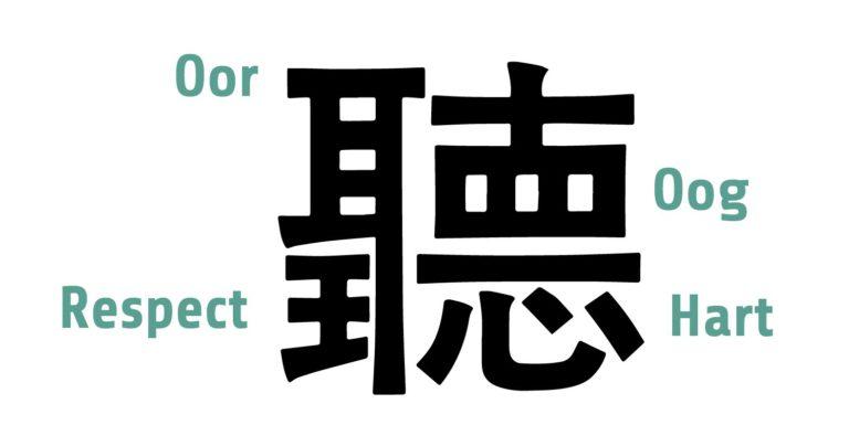 Maar wat is echt luisteren? We gaan ten rade bij het Chinese teken voor luisteren. Dit teken bevat de subkarakters hart, oog, oor en respect. Voor de Chinezen is luisteren dus niet alleen een kwestie van je zintuigen gebruiken. Het is als het ware met heel je wezen aandacht geven aan je gesprekspartner(s). Dát is luisteren!